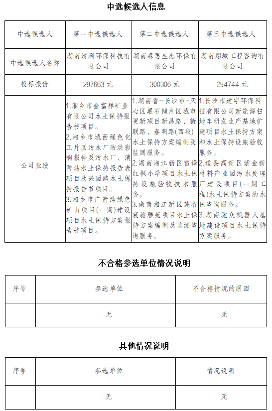 衡陽(國際)眼鏡小鎮(標準廠房A1區項目、10KV配電工程項目)水土保持咨詢服務于2025年9月30日9:00在衡陽國投4棟3樓評標室進行了比選開標、評標活動,評標委員會按照比選文件及相關法律法規規定進行評審,推薦以下三名中選候選人(排序),現將相關信息予以公示。
